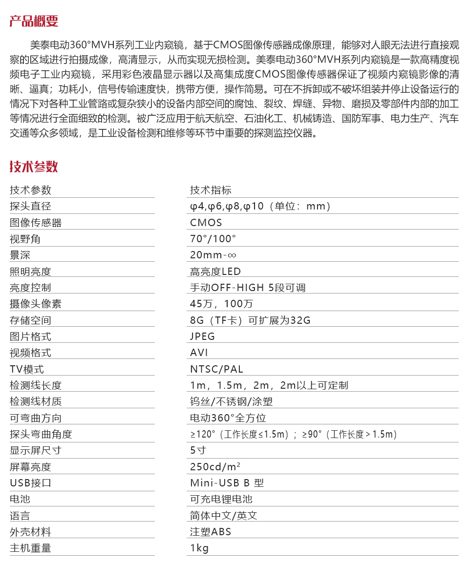 美泰電動360°MVH系列工業(yè)內(nèi)窺鏡,基于CMOS圖像傳感器成像原理,能夠?qū)θ搜蹮o法進(jìn)行直接觀察的區(qū)域進(jìn)行拍攝成像,高清顯示,從而實(shí)現(xiàn)無損檢測。美泰電動360°MVH系列內(nèi)窺鏡是一款高精度視頻電子工業(yè)內(nèi)窺鏡,采用彩色液晶顯示器以及高集成度CMOS圖像傳感器保證了視頻內(nèi)窺鏡影像的清晰、逼真;功耗小,信號傳輸速度快,攜帶方便,操作簡易??稍?/span>不拆卸或不破壞組裝并停止設(shè)備運(yùn)行的情況下對各種工業(yè)管路或復(fù)雜狹小的設(shè)備內(nèi)部空間的腐蝕、裂紋、焊縫、異物、磨損及零部件內(nèi)部的加工等情況進(jìn)行全面細(xì)致的檢測。被廣泛應(yīng)用于航天航空、石油化工、機(jī)械鑄造、國防軍事、電力生產(chǎn)、汽車交通等眾多領(lǐng)域,是工業(yè)設(shè)備檢測和維修等環(huán)節(jié)中重要的探測監(jiān)控儀器。