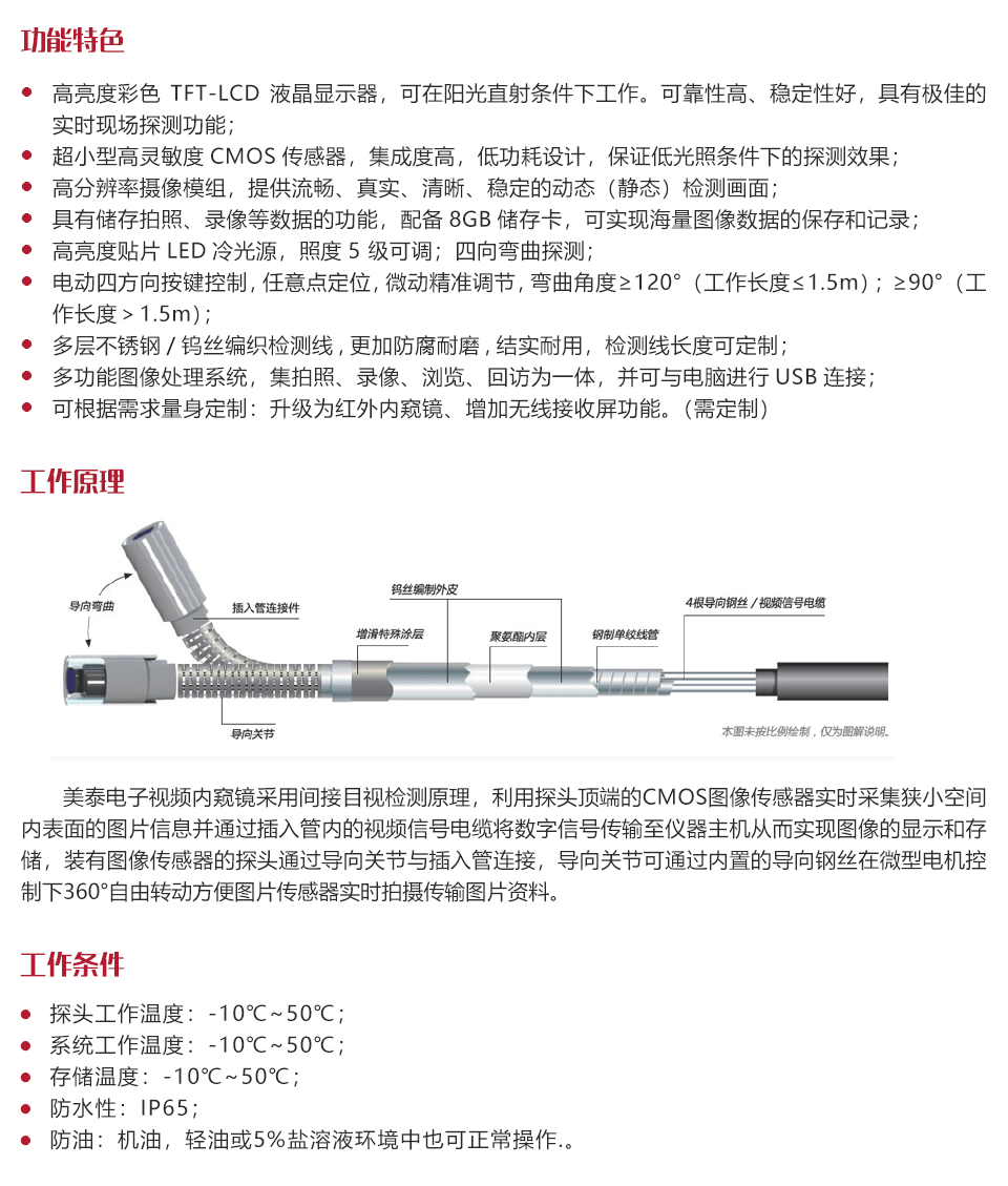 工作原理美泰電子視頻內(nèi)窺鏡采用間接目視檢測原理,利用探頭頂端的CMOS圖像傳感器實(shí)時(shí)采集狹小空間內(nèi)表面的圖片信息并通過插入管內(nèi)的視頻信號電纜將數(shù)字信號傳輸至儀器主機(jī)從而實(shí)現(xiàn)圖像的顯示和存儲,裝有圖像傳感器的探頭通過導(dǎo)向關(guān)節(jié)與插入管連接,導(dǎo)向關(guān)節(jié)可通過內(nèi)置的導(dǎo)向鋼絲在微型電機(jī)控制下360°自由轉(zhuǎn)動方便圖片傳感器實(shí)時(shí)拍攝傳輸圖片資料。