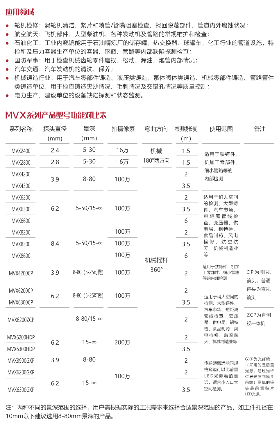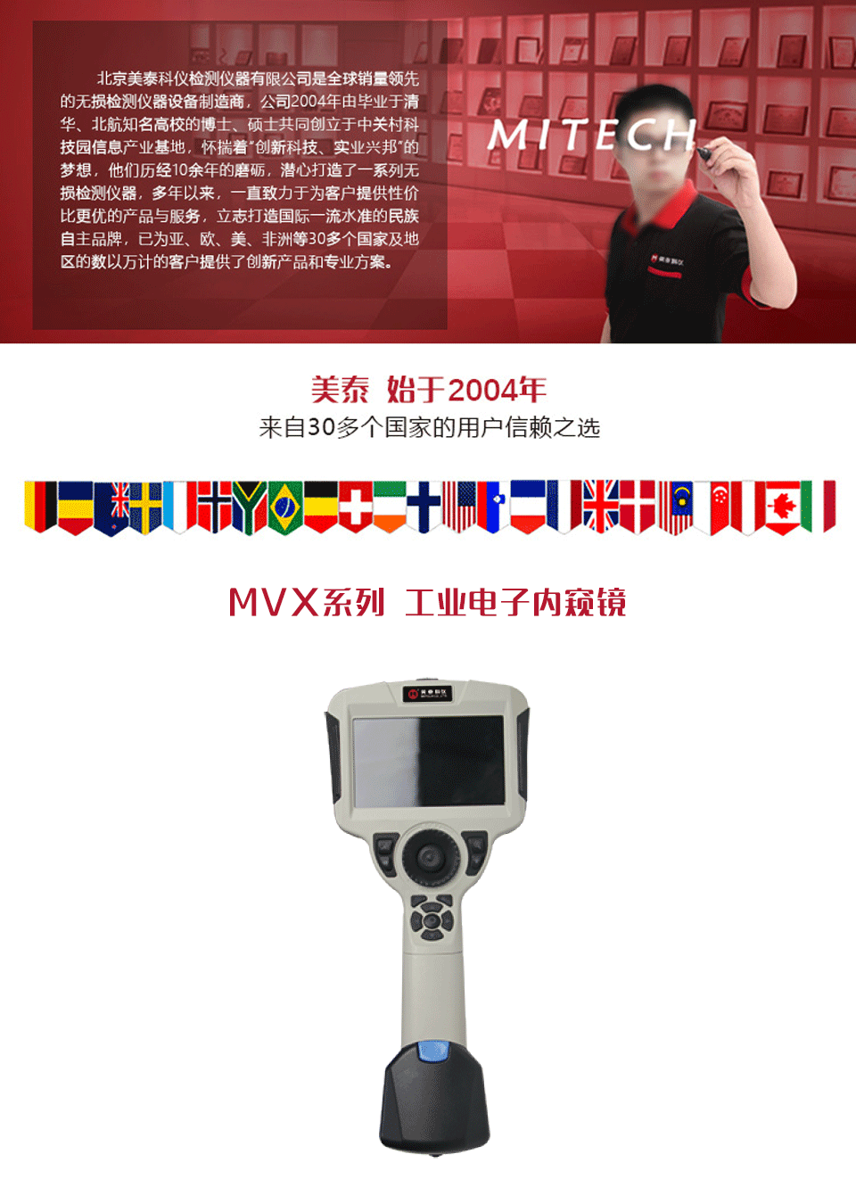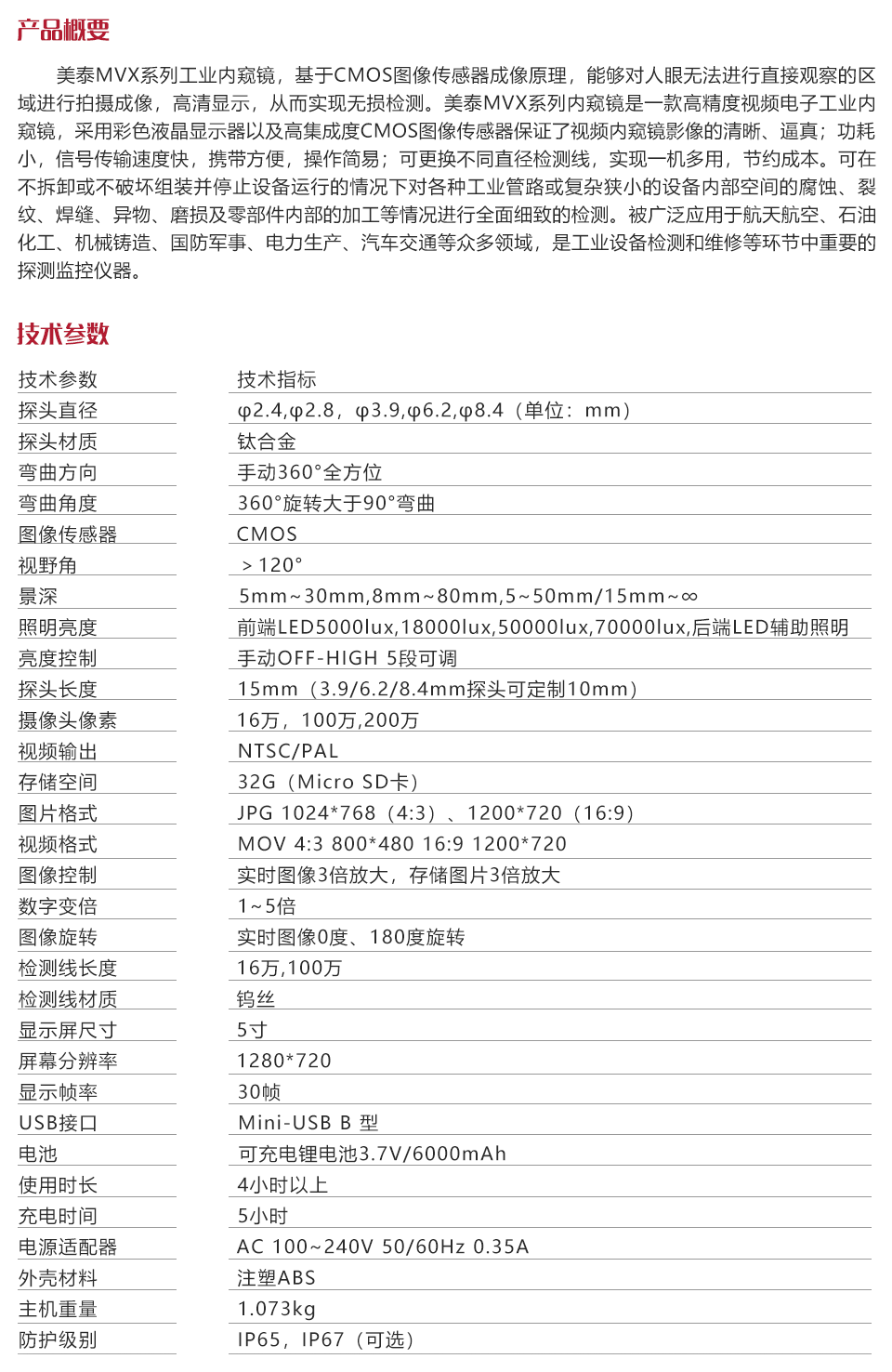 美泰MVX系列工業(yè)內(nèi)窺鏡,基于CMOS圖像傳感器成像原理,能夠對人眼無法進(jìn)行直接觀察的區(qū)域進(jìn)行拍攝成像,高清顯示,從而實現(xiàn)無損檢測。美泰MVX系列內(nèi)窺鏡是一款高精度視頻電子工業(yè)內(nèi)窺鏡,采用彩色液晶顯示器以及高集成度CMOS圖像傳感器保證了視頻內(nèi)窺鏡影像的清晰、逼真;功耗小,信號傳輸速度快,攜帶方便,操作簡易;可更換不同直徑檢測線,實現(xiàn)一機多用,節(jié)約成本??稍?/span>不拆卸或不破壞組裝并停止設(shè)備運行的情況下對各種工業(yè)管路或復(fù)雜狹小的設(shè)備內(nèi)部空間的腐蝕、裂紋、焊縫、異物、磨損及零部件內(nèi)部的加工等情況進(jìn)行全面細(xì)致的檢測。被廣泛應(yīng)用于航天航空、石油化工、機械鑄造、國防軍事、電力生產(chǎn)、汽車交通等眾多領(lǐng)域,是工業(yè)設(shè)備檢測和維修等環(huán)節(jié)中重要的探測監(jiān)控儀器。