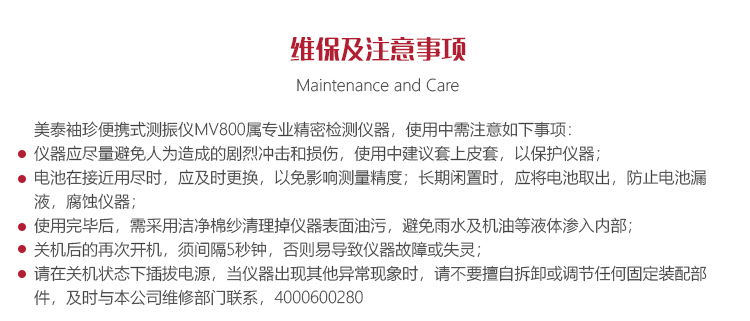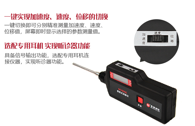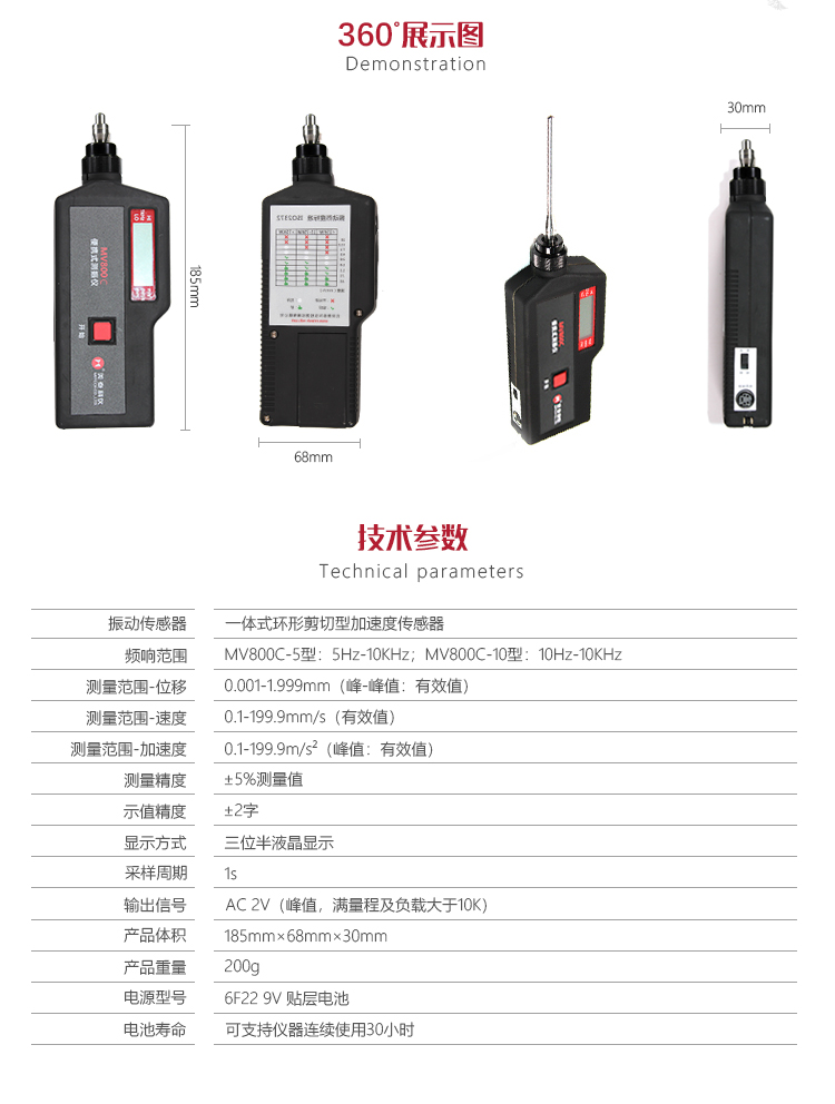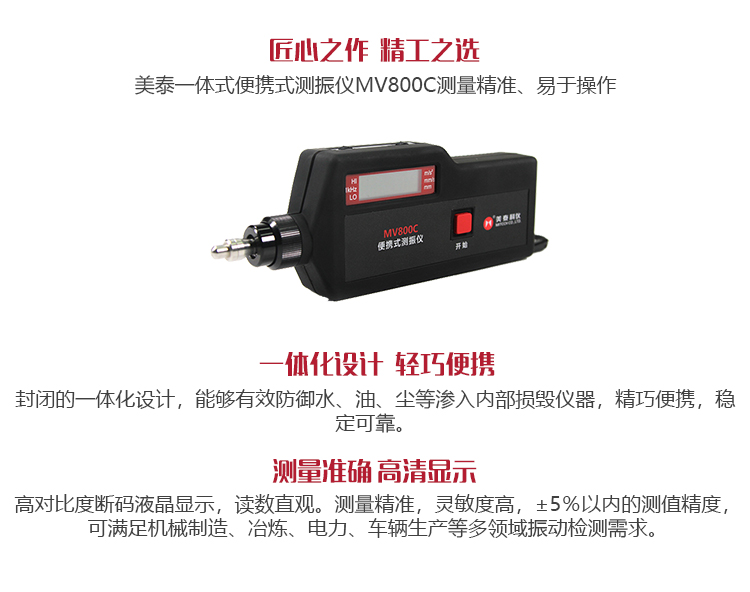 產品概述美泰袖珍一體化測振儀MV800C系列是由壓電式傳感器和數字顯示電路組成的手持式測振儀表,主要用于測量各種旋轉機械的振動加速度、速度和位移。MV800C系列分兩種型號MV800C-5(頻響范圍:5Hz~10KHz)和MV800C-10(頻響范圍:10Hz~10KH),可滿足常規(guī)測振使用需求以及低頻振動測量需求。該產品測量范圍廣,顯示直觀、一體化的設計體積小、重量輕,測量攜帶方便,特別適用于野外無電源的現(xiàn)場作業(yè)及高空作業(yè),大大減少工作人員的工作強度,提高工作效率。
