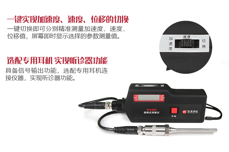 產(chǎn)品概述美泰便攜式測振儀MV800系列是由壓電式傳感器和數(shù)字顯示電路組成的手持式測振儀表,主要用于測量各種旋轉(zhuǎn)機(jī)械的振動加速度、速度和位移。MV800系列分兩種型號MV800-5(頻響范圍:5Hz~10KHz)和MV800-10(頻響范圍:10Hz~10KH),可滿足常規(guī)測振使用需求以及低頻振動測量需求。該產(chǎn)品測量范圍廣,顯示直觀、一體化的設(shè)計體積小、重量輕,測量攜帶方便,特別適用于野外無電源的現(xiàn)場作業(yè)及高空作業(yè),大大減少工作人員的工作強(qiáng)度,提高工作效率。