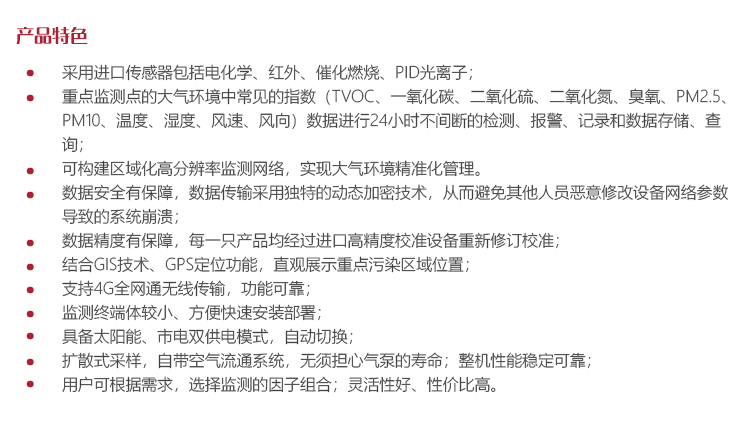 它基于高精度四電極電化學(xué)及光學(xué)技術(shù)原理,可實(shí)時(shí)監(jiān)測大氣環(huán)境中常見的指數(shù)(TVOC、一氧化碳、二氧化硫、二氧化氮、臭氧、PM2.5、PM10、溫度、濕度、風(fēng)速、風(fēng)向),