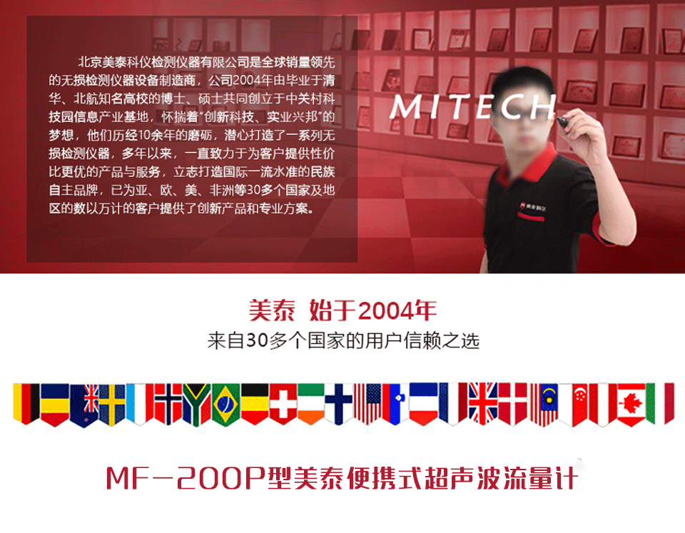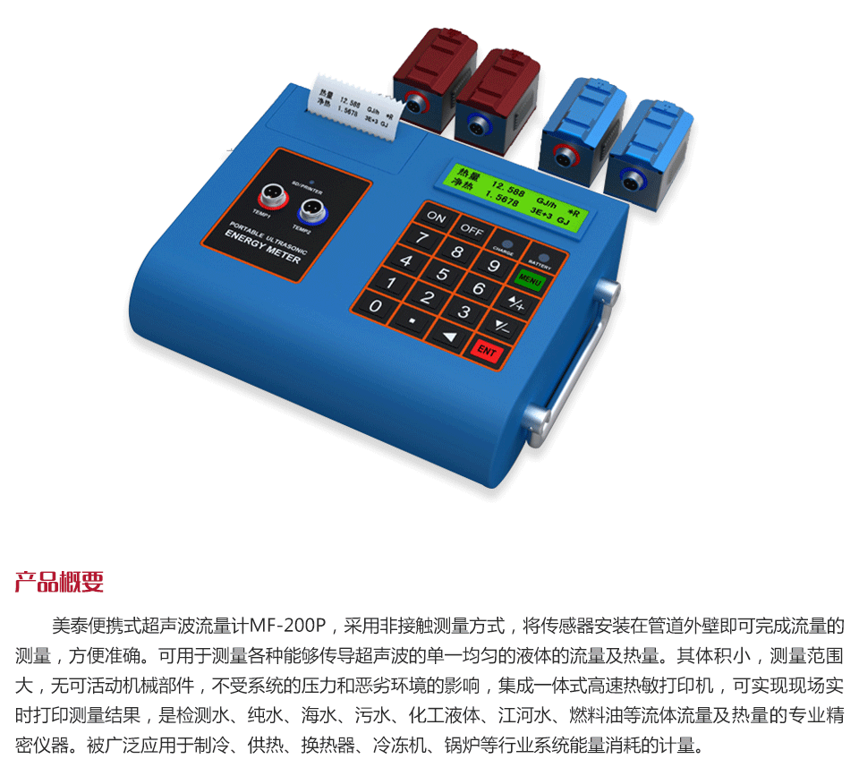 產(chǎn)品概述美泰便攜式超聲波流量計MF-200P,采用非接觸測量方式,將傳感器安裝在管道外壁即可完成流量的測量,方便準確??捎糜跍y量各種能夠傳導超聲波的單一均勻的液體的流量及熱量。其體積小,測量范圍大,無可活動機械部件,不受系統(tǒng)的壓力和惡劣環(huán)境的影響,集成一體式高速熱敏打印機,可實現(xiàn)現(xiàn)場實時打印測量結(jié)果,是檢測水、純水、海水、污水、化工液體、江河水、燃料油等流體流量及熱量的專業(yè)精密儀器。被廣泛應(yīng)用于制冷、供熱、換熱器、冷凍機、鍋爐等行業(yè)系統(tǒng)能量消耗的計量。