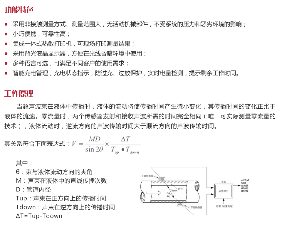 工作原理當超聲波束在液體中傳播時,液體的流動將使傳播時間產(chǎn)生微小變化,其傳播時間的變化正比于液體的流速。零流量時,兩個傳感器發(fā)射和接收聲波所需的時間完全相同(唯一可實際測量零流量的技術(shù)),液體流動時,逆流方向的聲波傳輸時間大于順流方向的聲波傳輸時間。