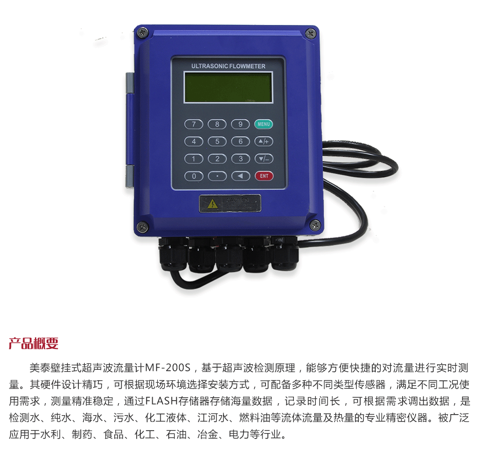 產(chǎn)品概述美泰壁掛式超聲波流量計(jì)MF-200S,基于超聲波檢測(cè)原理,能夠方便快捷的對(duì)流量進(jìn)行實(shí)時(shí)測(cè)量。其硬件設(shè)計(jì)精巧,可根據(jù)現(xiàn)場(chǎng)環(huán)境選擇安裝方式,可配備多種不同類型傳感器,滿足不同工況使用需求,測(cè)量精準(zhǔn)穩(wěn)定,通過FLASH存儲(chǔ)器存儲(chǔ)海量數(shù)據(jù),記錄時(shí)間長(zhǎng),可根據(jù)需求調(diào)出數(shù)據(jù),是檢測(cè)水、純水、海水、污水、化工液體、江河水、燃料油等流體流量及熱量的專業(yè)精密儀器。被廣泛應(yīng)用于水利、制藥、食品、化工、石油、冶金、電力等行業(yè)。