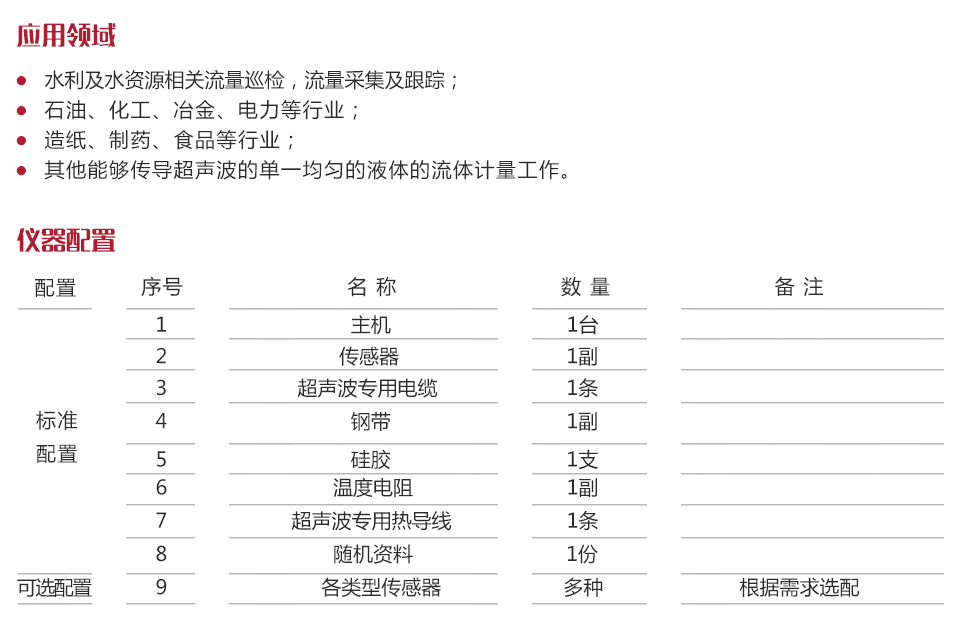 | 流體種類 | 水、海水、污水、酸堿液、酒精、啤酒、各種油類等能傳導(dǎo)超聲波的單一均勻液體 |