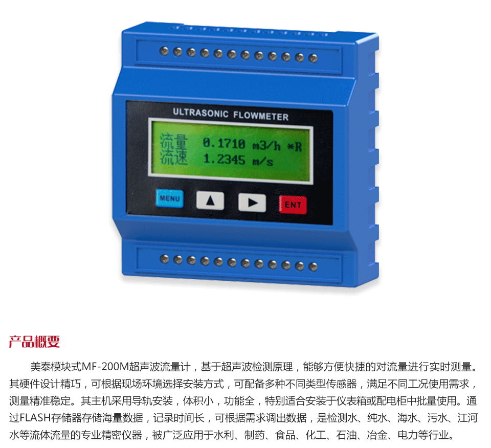 產(chǎn)品概述美泰模塊式MF-200M超聲波流量計,基于超聲波檢測原理,能夠方便快捷的對流量進(jìn)行實時測量。其硬件設(shè)計精巧,可根據(jù)現(xiàn)場環(huán)境選擇安裝方式,可配備多種不同類型傳感器,滿足不同工況使用需求,測量精準(zhǔn)穩(wěn)定。其主機(jī)采用導(dǎo)軌安裝,體積小,功能全,特別適合安裝于儀表箱或配電柜中批量使用。通過FLASH存儲器存儲海量數(shù)據(jù),記錄時間長,可根據(jù)需求調(diào)出數(shù)據(jù),是檢測水、純水、海水、污水、、江河水等流體流量的專業(yè)精密儀器,被廣泛應(yīng)用于水利、制藥、食品、化工、石油、冶金、電力等行業(yè)。