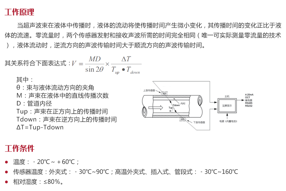 工作原理當(dāng)超聲波束在液體中傳播時,液體的流動將使傳播時間產(chǎn)生微小變化,其傳播時間的變化正比于液體的流速。零流量時,兩個傳感器發(fā)射和接收聲波所需的時間完全相同(唯一可實際測量零流量的技術(shù)),液體流動時,逆流方向的聲波傳輸時間大于順流方向的聲波傳輸時間。