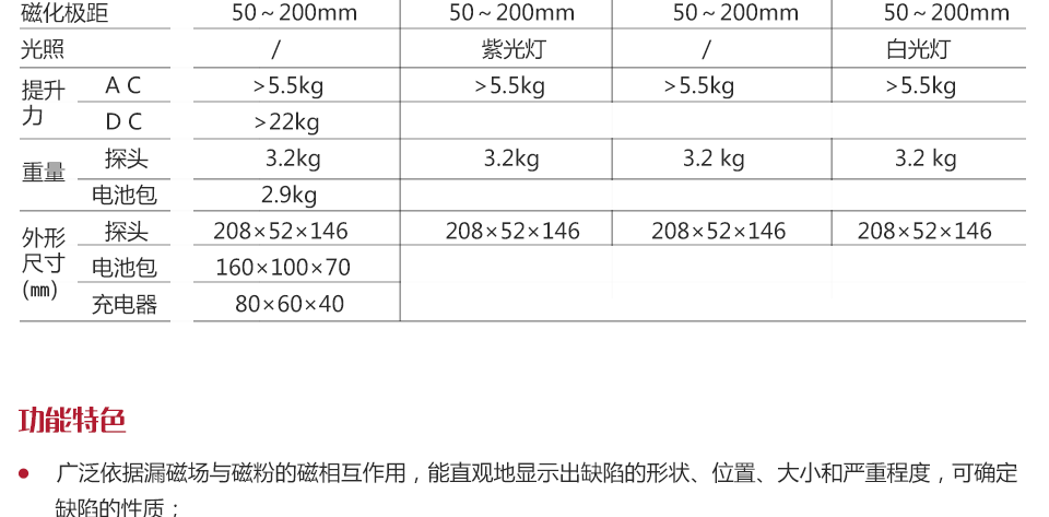 ? 白光配置的CJE220D可進行普通磁粉探傷,紫光配置的CDX220可進行紫光磁粉探傷,磁軛間距可調(diào)節(jié),一體化設(shè)計結(jié)構(gòu)緊湊、布局合理、體積小巧、方便攜帶,可滿足不同用戶的不同需求;