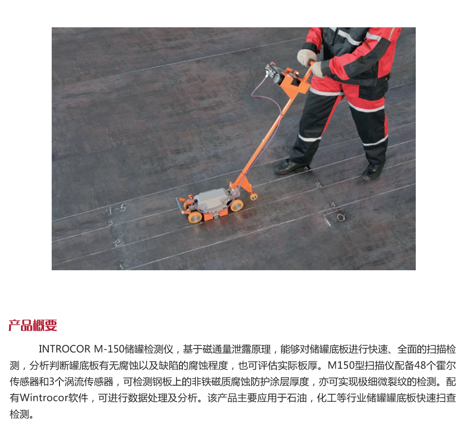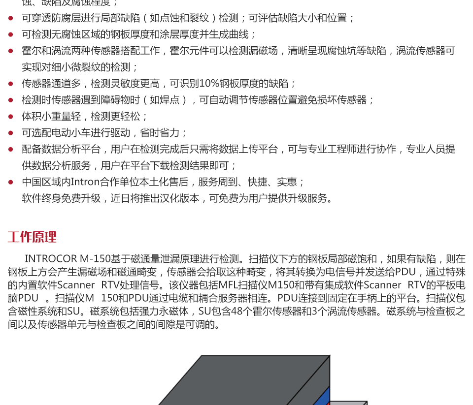 Intron M-150儲罐檢測儀,基于磁通量泄露原理,能夠?qū)薜装暹M行快速、全面的掃描檢測,分析判斷罐底板有 無腐蝕以及缺陷的腐蝕程度,也可評估實際板厚。M150型掃描儀配備48個霍爾傳感器和3個渦流傳感器,可檢測鋼板上 的非鐵磁質(zhì)腐蝕防護涂層厚度,亦可實現(xiàn)極細微裂紋的檢測。配有Wintrocor軟件,可進行數(shù)據(jù)處理及分析。該產(chǎn)品主 要應(yīng)用于石油,化工等行業(yè)儲罐罐底板快速掃查檢測。