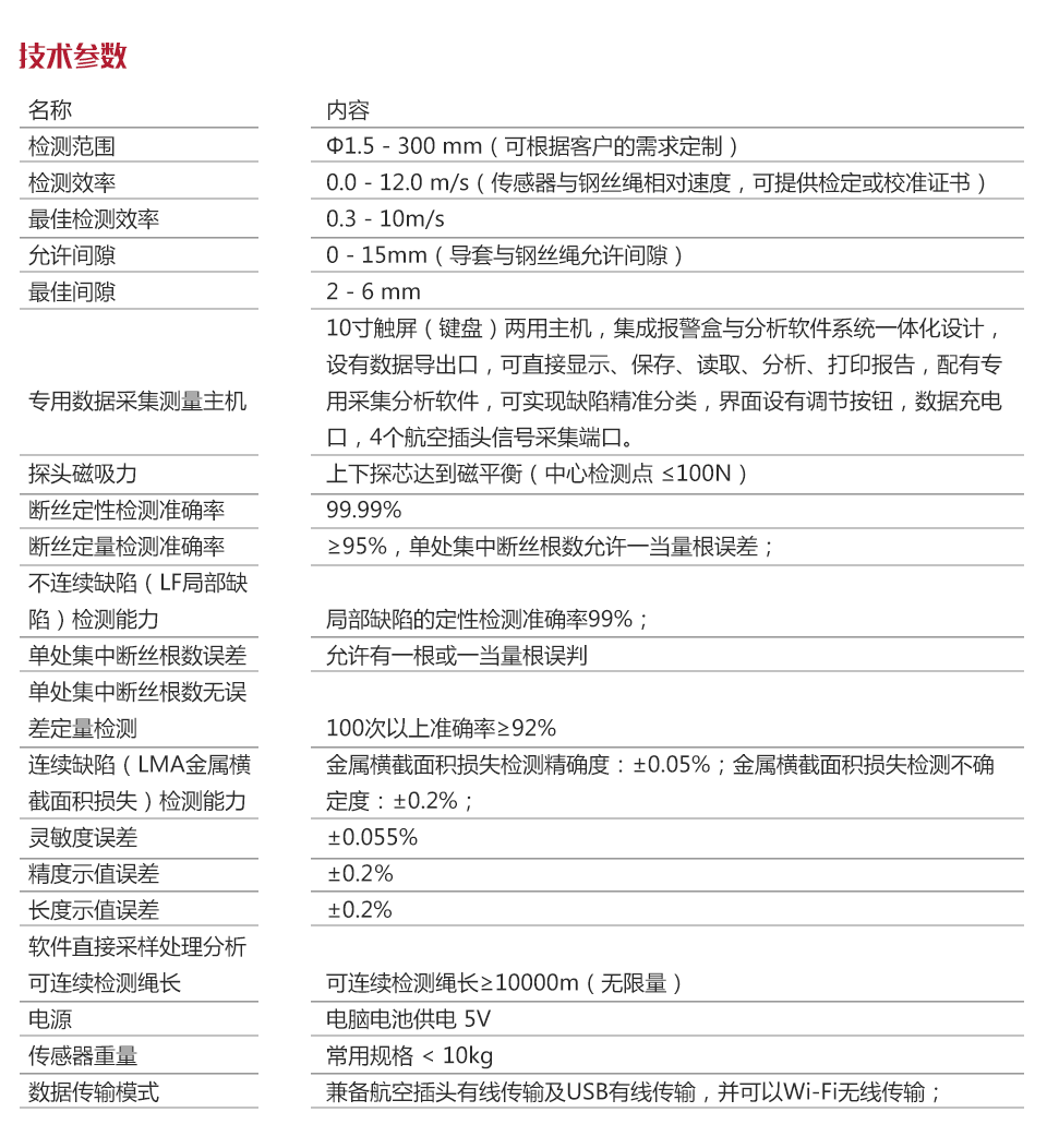 | 斷絲定量檢測準(zhǔn)確率 | ≥95%,單處集中斷絲根數(shù)允許一當(dāng)量根誤差; |