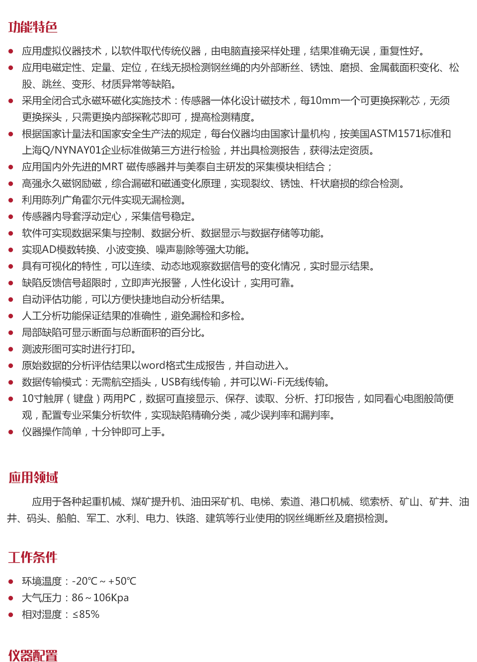 功能用途應(yīng)用于各種起重機(jī)械、煤礦提升機(jī)、油田采礦機(jī)、電梯、索道、港口機(jī)械、纜索橋、礦山、礦井、油井、碼頭、船舶、軍工、水利、電力、鐵路、建筑等行業(yè)使用的鋼絲繩斷絲及磨損檢測。