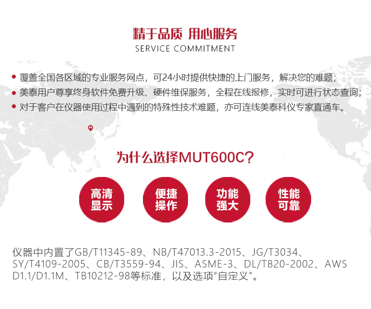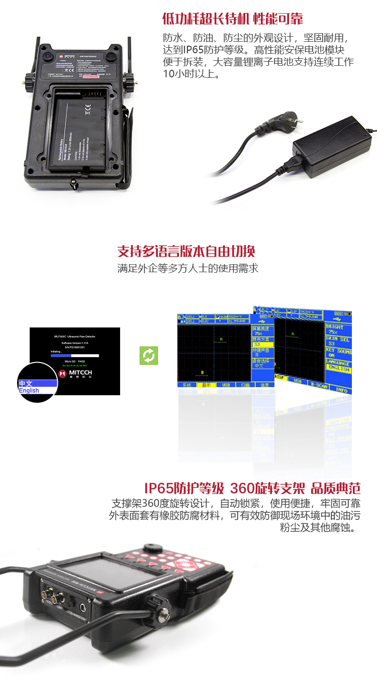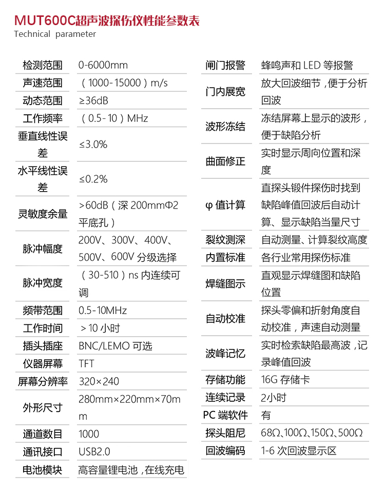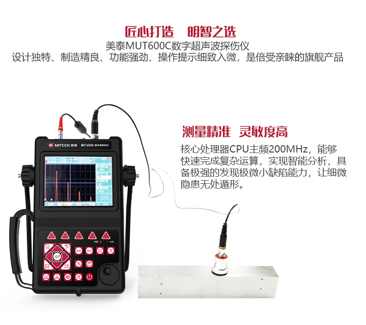 產品概述MUT600C數字式超聲波探傷儀基于超聲傳播原理,可精準、靈敏地進行工件內部多種缺陷(裂紋、夾雜、氣孔等)的檢測、定位、評估和診斷。采用全數字TFT 320×240真彩色液晶顯示屏,可根據環(huán)境選擇操作界面風格,液晶亮度可調節(jié),界面設計人性化、波形顯示細膩;可全屏清晰發(fā)現(xiàn)缺陷;單手可把持操作,曲線制作、探頭校準等操作均可自動完成;既可用以用于實驗室,也可以用于工程現(xiàn)場。0-6000mm普通量程可滿足制造業(yè)、鋼鐵冶金業(yè)、金屬加工也、化工業(yè)等常規(guī)的缺陷檢測需求,低功耗設計配備大容量高性能鋰離子電池模塊可連續(xù)工作10小時以上;質優(yōu)價廉,是實用經濟款超聲檢測儀器的首選。