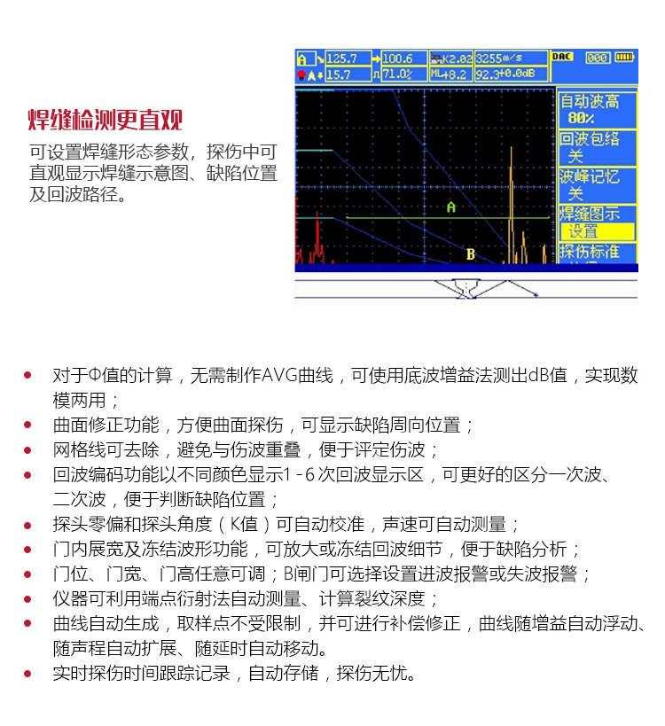| 定位 | 實時顯示缺陷水平、深度(垂直)、聲程位置 |