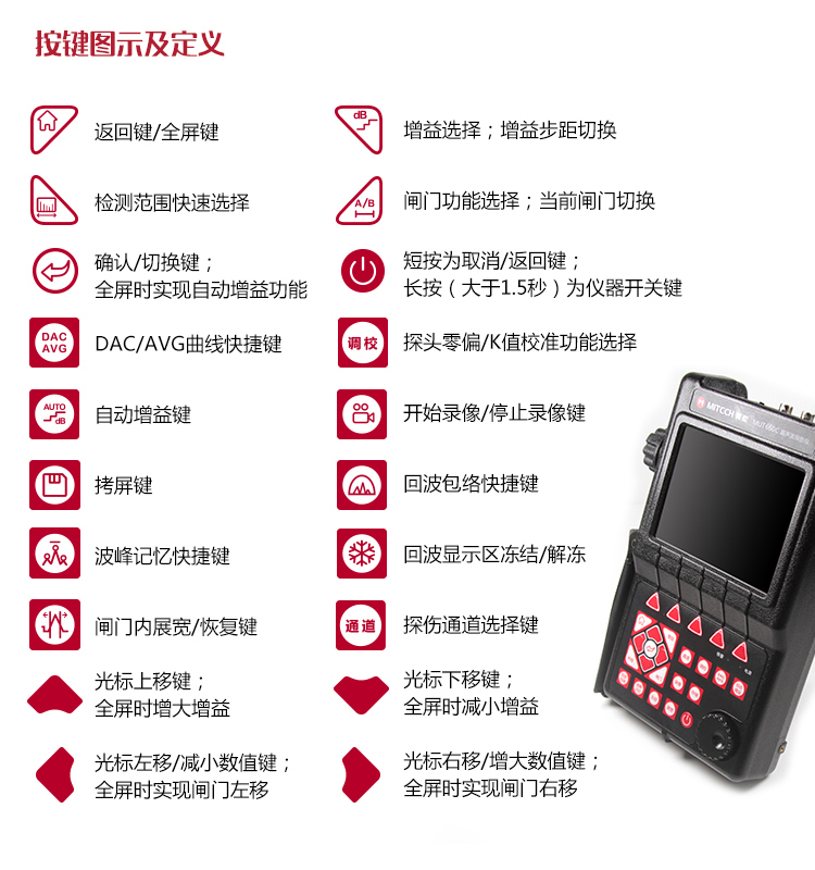 | 自動校準 | 探頭零點和探頭角度(K值)自動校準功能;聲速自動測量功能 |