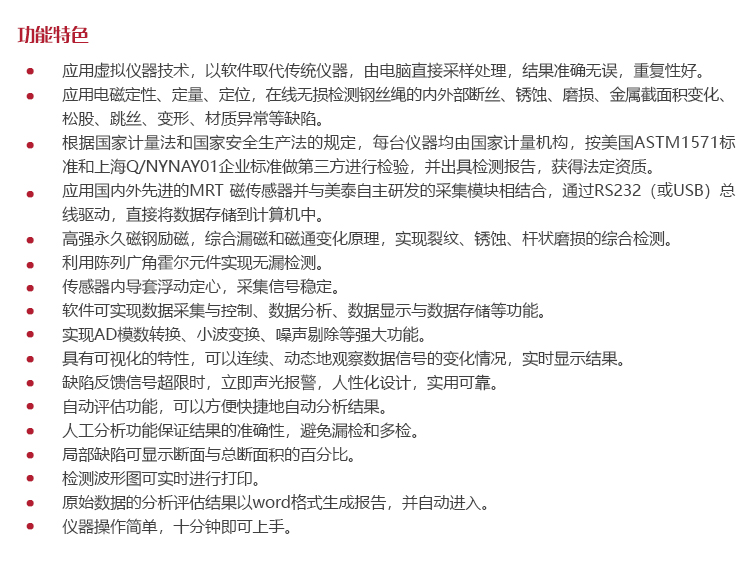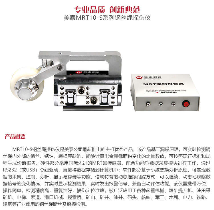 產(chǎn)品概述MRT10-S鋼絲繩探傷儀是美泰公司最新研發(fā)的無損檢測(cè)產(chǎn)品,該產(chǎn)品基于漏磁原理,可實(shí)時(shí)檢測(cè)鋼絲繩內(nèi)外部的斷絲、銹蝕、磨損等缺陷,能夠計(jì)算出金屬截面積變化的定量數(shù)值,可按照現(xiàn)行標(biāo)準(zhǔn)和規(guī)程生成診斷報(bào)告。硬件部分采用國際先進(jìn)的MRT磁傳感器,配合功能型數(shù)據(jù)采集模塊進(jìn)行工作,通過RS232(或USB)總線驅(qū)動(dòng),直接將數(shù)據(jù)存儲(chǔ)到計(jì)算機(jī)中;軟件部分基于小波變換分析原理,可實(shí)現(xiàn)數(shù)據(jù)的采集、控制、分析、顯示與存儲(chǔ)等功能;借助特有的動(dòng)態(tài)連續(xù)跟蹤方式,可以連續(xù)、動(dòng)態(tài)地觀察數(shù)據(jù)信號(hào)的變化情況,并實(shí)時(shí)顯示檢測(cè)結(jié)果,實(shí)時(shí)發(fā)出報(bào)警信號(hào);兼?zhèn)渥詣?dòng)評(píng)估功能。該儀器攜帶方便,操作簡(jiǎn)單,檢測(cè)精度高,重復(fù)性好,損傷定位準(zhǔn)確,被廣泛應(yīng)用于各種起重機(jī)械、煤礦提升機(jī)、油田采礦機(jī)、電梯、索道、港口機(jī)械、纜索橋、礦山、礦井、油井、碼頭、船舶、軍工、水利、電力、鐵路、建筑等行業(yè)使用的鋼絲繩斷絲及磨損檢測(cè)。