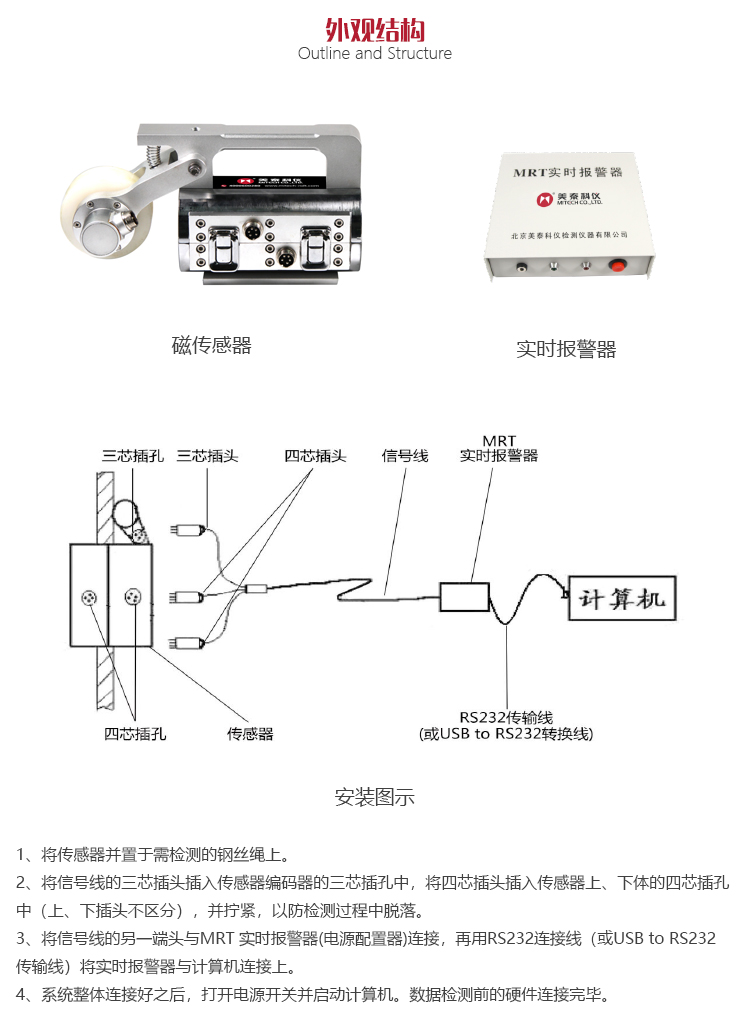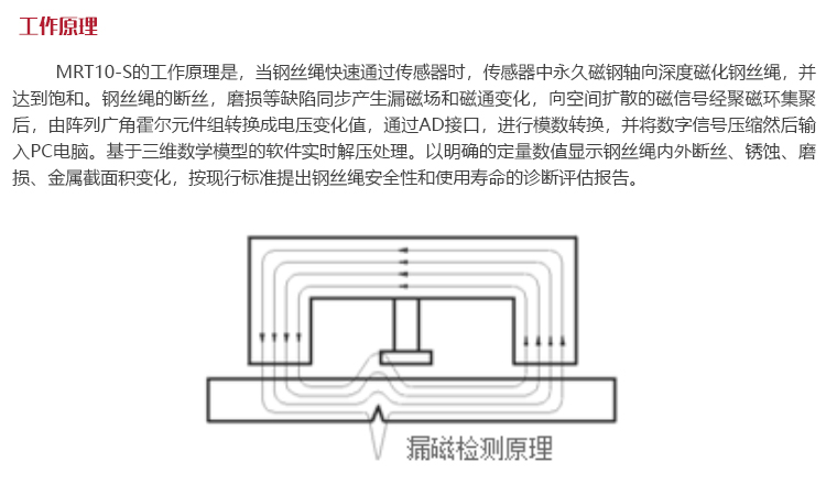 工作原理MRT10-S的工作原理是,當(dāng)鋼絲繩快速通過傳感器時(shí),傳感器中永久磁鋼軸向深度磁化鋼絲繩,并達(dá)到飽和。鋼絲繩的斷絲,磨損等缺陷同步產(chǎn)生漏磁場(chǎng)和磁通變化,向空間擴(kuò)散的磁信號(hào)經(jīng)聚磁環(huán)集聚后,由陣列廣角霍爾元件組轉(zhuǎn)換成電壓變化值,通過AD接口,進(jìn)行模數(shù)轉(zhuǎn)換,并將數(shù)字信號(hào)壓縮然后輸入PC電腦?;谌S數(shù)學(xué)模型的軟件實(shí)時(shí)解壓處理。以明確的定量數(shù)值顯示鋼絲繩內(nèi)外斷絲、銹蝕、磨損、金屬截面積變化,按現(xiàn)行標(biāo)準(zhǔn)提出鋼絲繩安全性和使用壽命的診斷評(píng)估報(bào)告。