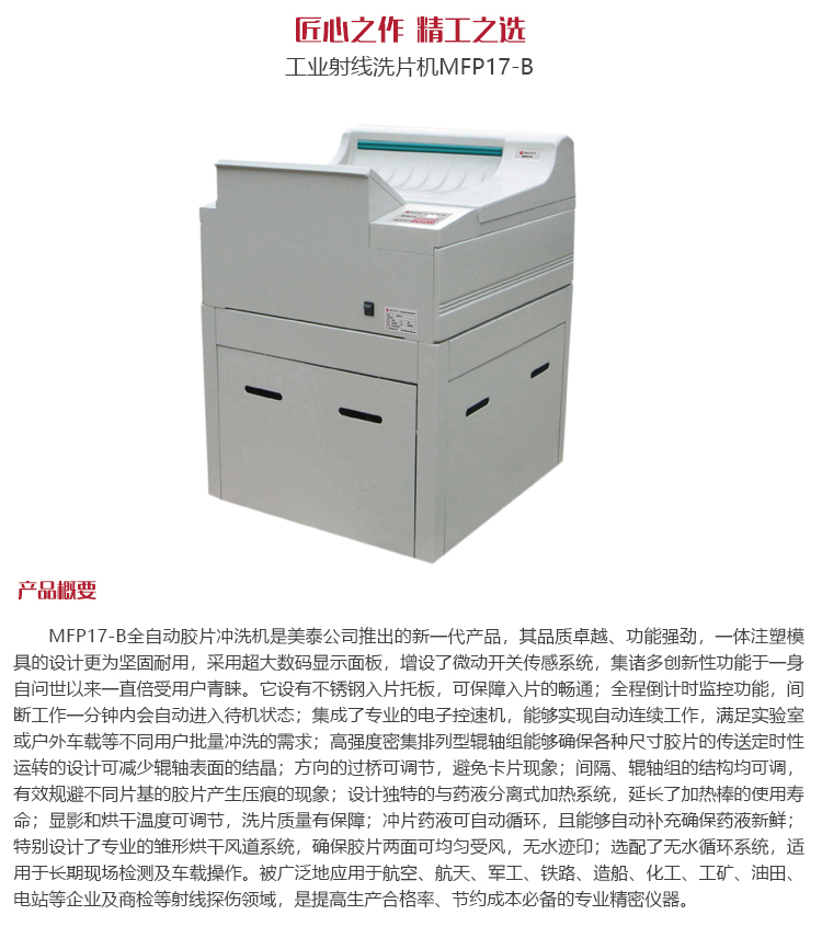 產(chǎn)品概述MFP17-B全自動(dòng)膠片沖洗機(jī)是美泰公司推出的新一代產(chǎn)品,其品質(zhì)卓越、功能強(qiáng)勁,一體注塑模具的設(shè)計(jì)更為堅(jiān)固耐用,采用超大數(shù)碼顯示面板,增設(shè)了微動(dòng)開關(guān)傳感系統(tǒng),集諸多創(chuàng)新性功能于一身,自問世以來一直倍受用戶青睞。它設(shè)有不銹鋼入片托板,可保障入片的暢通;全程倒計(jì)時(shí)監(jiān)控功能,間斷工作一分鐘內(nèi)會(huì)自動(dòng)進(jìn)入待機(jī)狀態(tài);集成了專業(yè)的電子控速機(jī),能夠?qū)崿F(xiàn)自動(dòng)連續(xù)工作,滿足實(shí)驗(yàn)室或戶外車載等不同用戶批量沖洗的需求;高強(qiáng)度密集排列型輥軸組能夠確保各種尺寸膠片的傳送;定時(shí)性運(yùn)轉(zhuǎn)的設(shè)計(jì)可減少輥軸表面的結(jié)晶;方向的過橋可調(diào)節(jié),避免卡片現(xiàn)象;間隔、輥軸組的結(jié)構(gòu)均可調(diào),有效規(guī)避不同片基的膠片產(chǎn)生壓痕的現(xiàn)象;設(shè)計(jì)獨(dú)特的與藥液分離式加熱系統(tǒng),延長了加熱棒的使用壽命;顯影和烘干溫度可調(diào)節(jié),洗片質(zhì)量有保障;沖片藥液可自動(dòng)循環(huán),且能夠自動(dòng)補(bǔ)充,確保藥液新鮮;特別設(shè)計(jì)了專業(yè)的雛形烘干風(fēng)道系統(tǒng),確保膠片兩面可均勻受風(fēng),無水跡??;選配了無水循環(huán)系統(tǒng),適用于長期現(xiàn)場檢測及車載操作。被廣泛地應(yīng)用于航空、航天、軍工、鐵路、造船、化工、工礦、油田、電站等企業(yè)及商檢等射線探傷領(lǐng)域,是提高生產(chǎn)合格率、節(jié)約成本必備的專業(yè)精密儀器。
