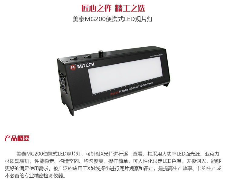 產(chǎn)品概述美泰MG200便攜式LED觀片燈,可針對(duì)X光片進(jìn)行逐一查看。其采用大功率LED面光源、亞克力材質(zhì)觀察屏,性能穩(wěn)定、構(gòu)造堅(jiān)固、均勻度高、操作簡(jiǎn)單,可人性化限定LED色溫、無(wú)極調(diào)光,能夠更好的滿足使用需求,被廣泛的應(yīng)用于X射線探傷進(jìn)行底片觀察和評(píng)定,是提高生產(chǎn)效率、節(jié)約生產(chǎn)成本必備的專業(yè)精密檢測(cè)儀器。