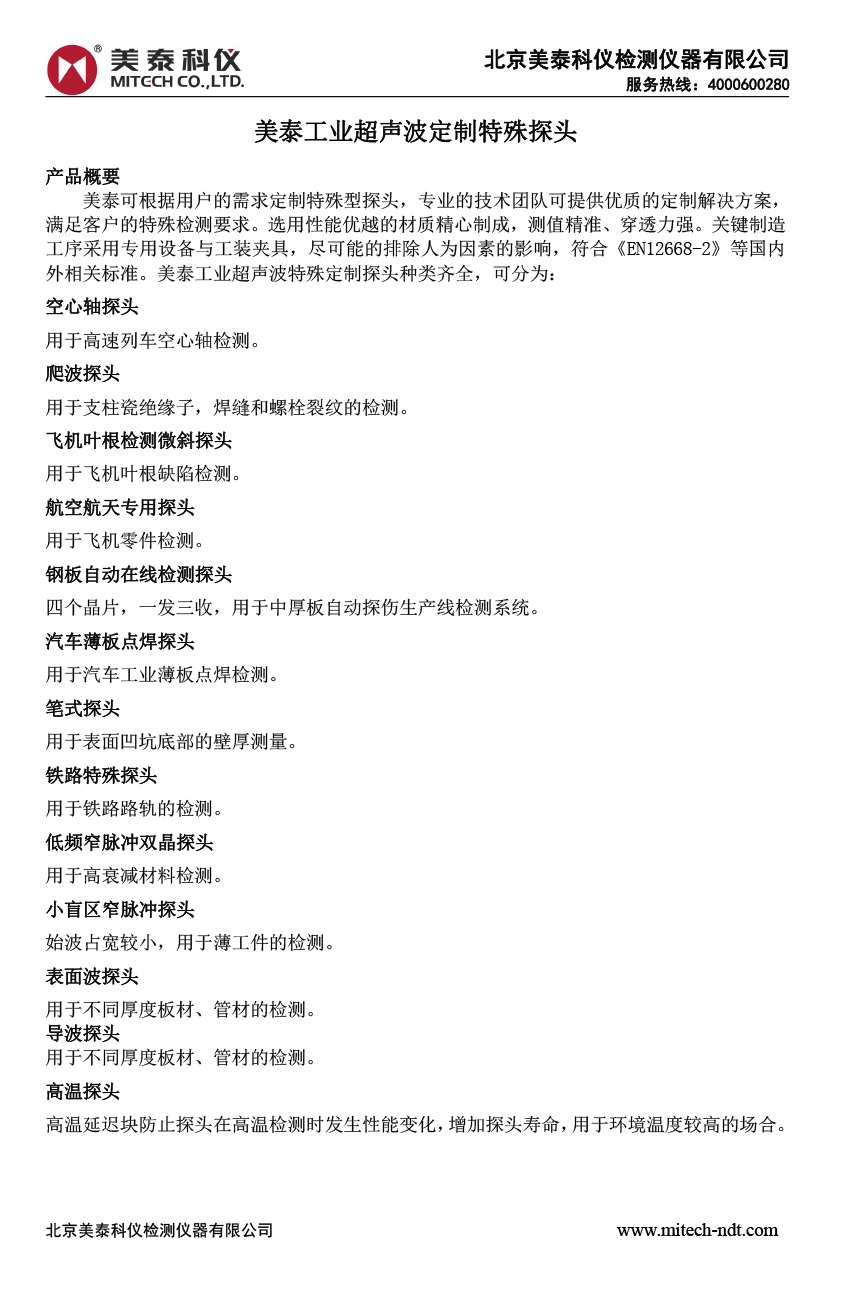 產(chǎn)品概述美泰可根據(jù)用戶的需求定制特殊型探頭,專業(yè)的技術(shù)團隊可提供優(yōu)質(zhì)的定制解決方案,滿足客戶的特殊檢測要求。選用性能優(yōu)越的材質(zhì)精心制成,測值精準、穿透力強。關(guān)鍵制造工序采用專用設備與工裝夾具,盡可能的排除人為因素的影響,符合《EN12668-2》等國內(nèi)外相關(guān)標準。