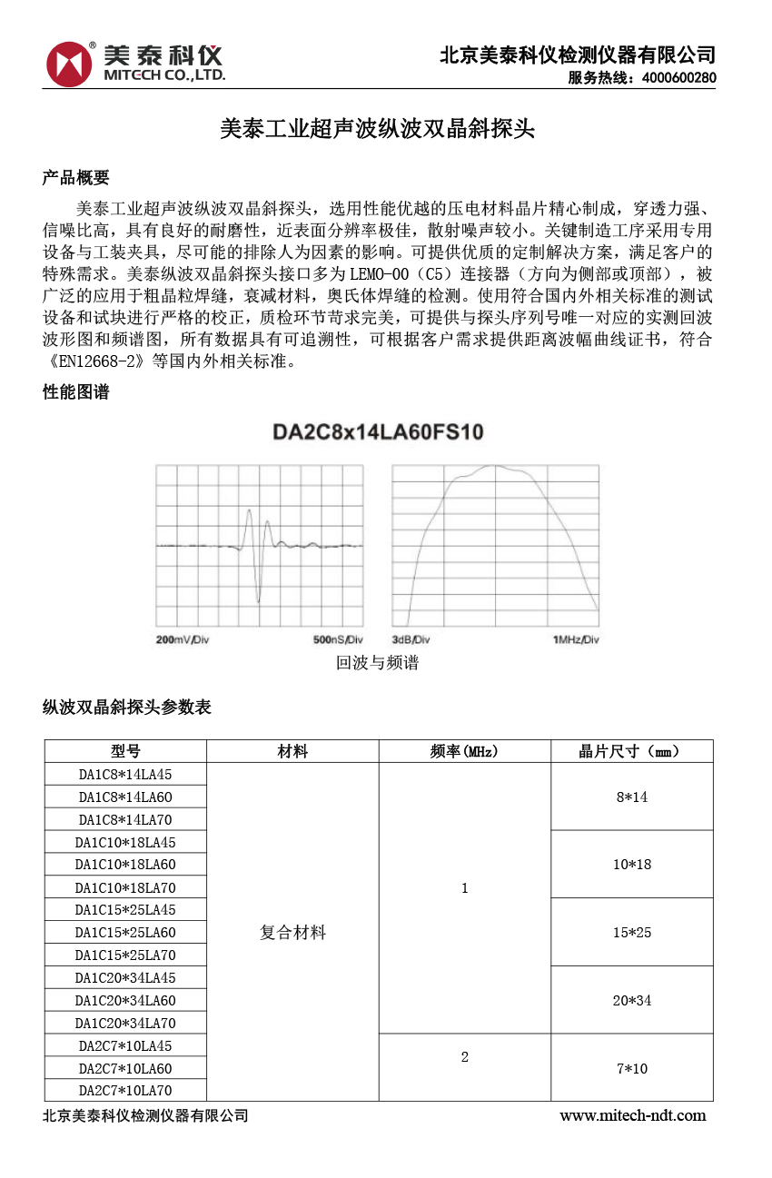 產品概述美泰工業(yè)超聲波縱波雙晶斜探頭,選用性能優(yōu)越的壓電材料晶片精心制成,穿透力強、信噪比高,具有良好的耐磨性,近表面分辨率極佳,散射噪聲較小。關鍵制造工序采用專用設備與工裝夾具,盡可能的排除人為因素的影響??商峁﹥?yōu)質的定制解決方案,滿足客戶的特殊需求。美泰縱波雙晶斜探頭接口多為LEMO-00(C5)連接器(方向為側部或頂部),被廣泛的應用于粗晶粒焊縫,衰減材料,奧氏體焊縫的檢測。使用符合國內外相關標準的測試設備和試塊進行嚴格的校正,質檢環(huán)節(jié)苛求完美,可提供與探頭序列號唯一對應的實測回波波形圖和頻譜圖,所有數據具有可追溯性,可根據客戶需求提供距離波幅曲線證書,符合《EN12668-2》等國內外相關標準。