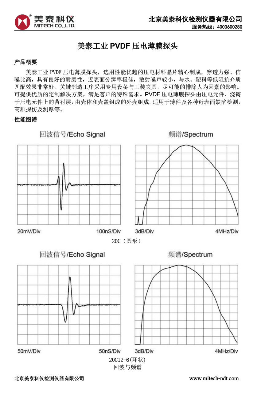 產(chǎn)品概述美泰工業(yè)PVDF壓電薄膜探頭,選用性能優(yōu)越的壓電材料晶片精心制成,穿透力強(qiáng)、信噪比高,具有良好的耐磨性,近表面分辨率極佳,散射噪聲較小,與水、塑料等低阻抗介質(zhì)匹配效果非常好。關(guān)鍵制造工序采用專用設(shè)備與工裝夾具,盡可能的排除人為因素的影響。可提供優(yōu)質(zhì)的定制解決方案,滿足客戶的特殊需求。PVDF壓電薄膜探頭由壓電元件、澆鑄于壓電元件上的背襯層,由殼體和殼蓋組成的外殼組成。適用于薄件及各種近表面缺陷檢測,高頻探傷及測厚等。