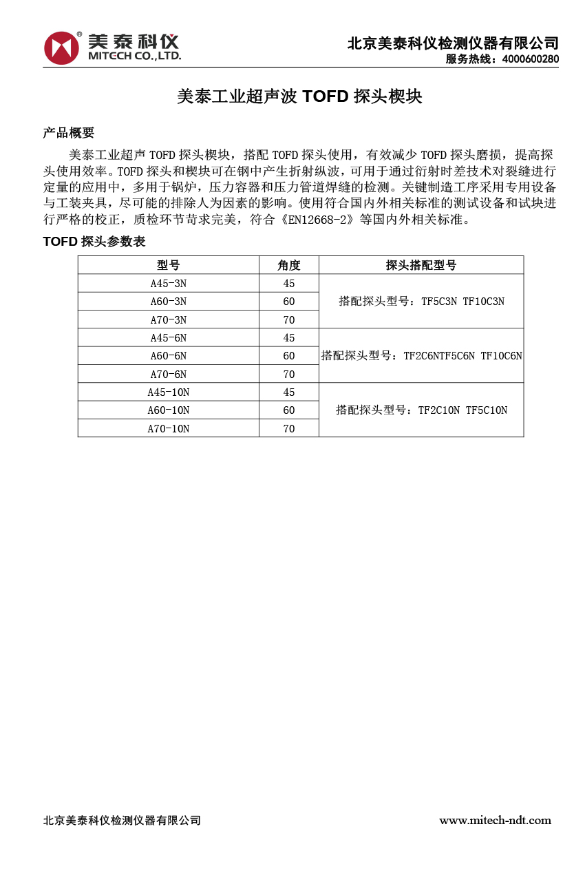 美泰工業(yè)超聲TOFD探頭楔塊,搭配TOFD探頭使用,有效減少TOFD探頭磨損,提高探頭使用效率。TOFD探頭和楔塊可在鋼中產(chǎn)生折射縱波,可用于通過衍射時(shí)差技術(shù)對(duì)裂縫進(jìn)行定量的應(yīng)用中,多用于鍋爐,壓力容器和壓力管道焊縫的檢測(cè)。關(guān)鍵制造工序采用專用設(shè)備與工裝夾具,盡可能的排除人為因素的影響。使用符合國內(nèi)外相關(guān)標(biāo)準(zhǔn)的測(cè)試設(shè)備和試塊進(jìn)行嚴(yán)格的校正,質(zhì)檢環(huán)節(jié)苛求完美,符合《EN12668-2》等國內(nèi)外相關(guān)標(biāo)準(zhǔn)。