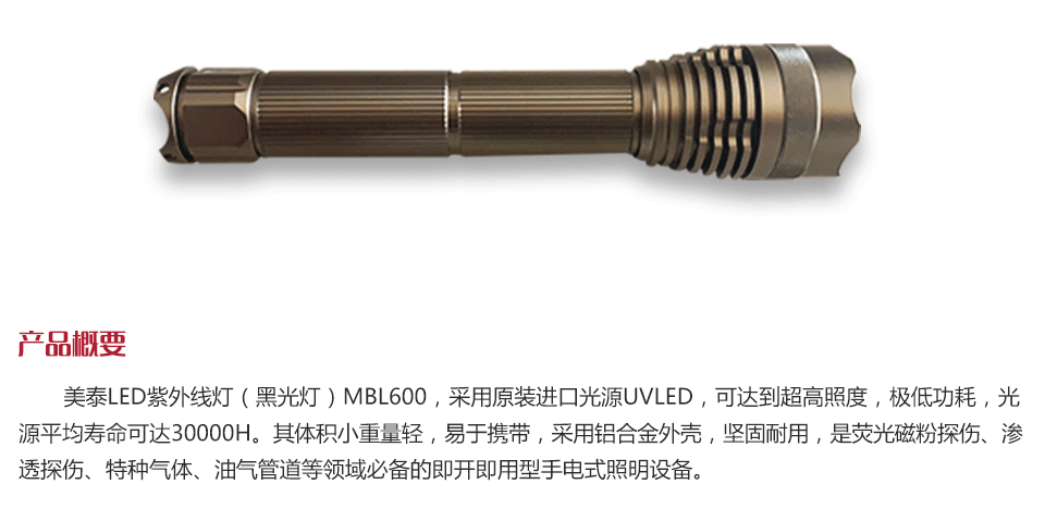 美泰LED紫外線燈(黑光燈)MBL600,采用原裝進口光源UVLED,可達到超高照度,極低功耗,光源平均壽命可達30000H。其體積小重量輕,易于攜帶,采用鋁合金外殼,堅固耐用,是熒光磁粉探傷、滲透探傷、特種氣體、油氣管道等領域必備的即開即用型手電式照明設備。
