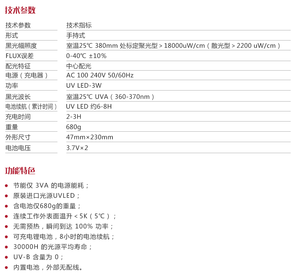 | 黑光幅照度 | 室溫25℃ 380mm 處標定聚光型>18000uW/cm2 (散光型>2200 uW/cm2) |