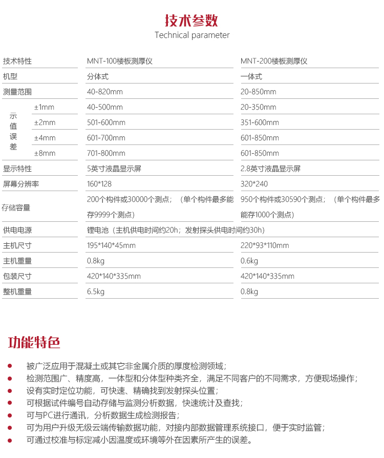 產(chǎn)品概述美泰MNT-200一體化樓板測(cè)厚儀,基于電磁波幅值衰減的原理,可有效對(duì)混凝土等非鐵磁體介質(zhì)進(jìn)行無(wú)損厚度測(cè)量。其體積小、重量輕,一體化設(shè)計(jì)集成度更高,故障率低。使用時(shí),通過(guò)主機(jī)屏幕上的箭頭指示來(lái)確定主機(jī)移動(dòng)方向,對(duì)準(zhǔn)發(fā)射探頭時(shí),儀器會(huì)智能判讀樓板厚度。其測(cè)值速度快、測(cè)量精度高、性能穩(wěn)定可靠,被廣泛應(yīng)用于建筑施工質(zhì)量監(jiān)控檢測(cè)等領(lǐng)域,是保障生命財(cái)產(chǎn)安全必備的專業(yè)精密檢測(cè)儀器。