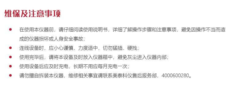 l 請勿擅自拆裝本儀器,維修相關事宜請聯(lián)系美泰科儀售后服務部,4000600280。